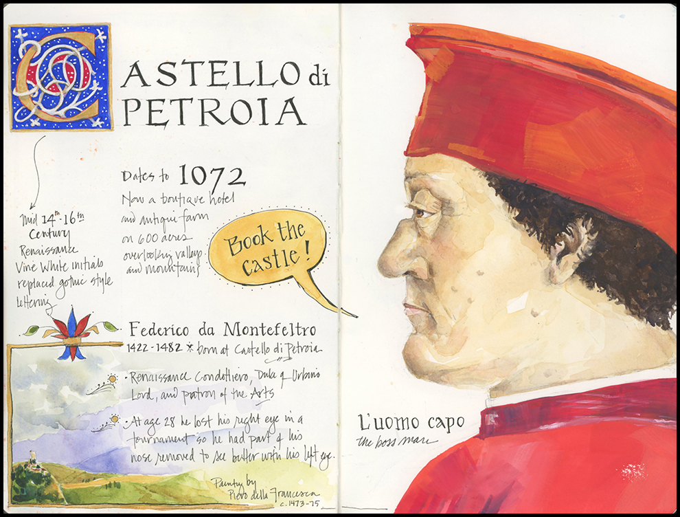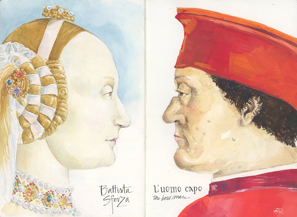 Tips and Techniques– Most of you know that I am not a painter of portraits. I participated in #oneweek100people in 2017 and that may have been the last time I painted a face. Apparently, the style of the day was to paint people in perfect profile, revealing no emotion. Both Federico and Battista are more severe in the original oil paintings than in mine. I found it challenging enough just getting proportions right and trying for a decent likeness. But what I mostly learned is that painting something completely different opens new doors that lead to interesting places. I should be brave enough to try it more often. There are a few spots left in the Italy travel workshop– find out more here >