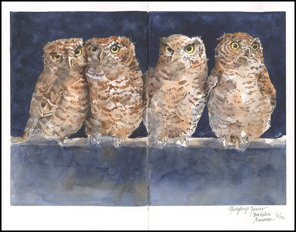 This weekend’s freezing temperatures sent me packing my sketchbook and paints and seeking shelter in the natural history collection at a nearby museum. Amidst a long wall of bird specimens, I found these four fledgling Eastern screech owls. Most collections typically display adult birds, so it was unusual to find an entire set of young siblings. I was grateful for the chance to study these common, yet elusive owls up close. And yet, they haunt me, too. Their life in the wild was so brief, their time behind glass so long. My goal with this painting was to try to bring a bit of life back to these young owls and to share a glimpse their wild, wary beauty with you.