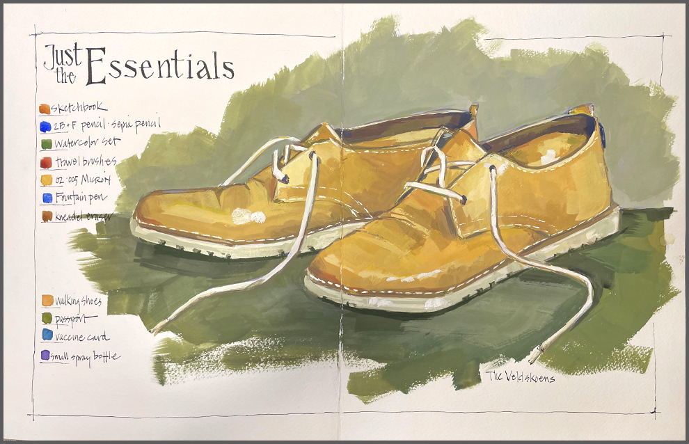 Tips and Techniques– I typically start a new journal when traveling, but I don’t want a big blank page staring at me when I arrive. Instead, I try to do some pre-trip pages to set the stage. This really helps me begin to think about letter styles, subject matter, color schemes, and materials. You can see that here on the opening page of place names. My initial idea for “Just the Essentials” was to sketch my shoes and my art supplies. But after struggling with the shoes, I decided to pull in the color grid element from the opening page and simply list the supplies. Who knows what will come next! Do you like to start ahead or do you wait until you are on location to begin your travel sketching?
