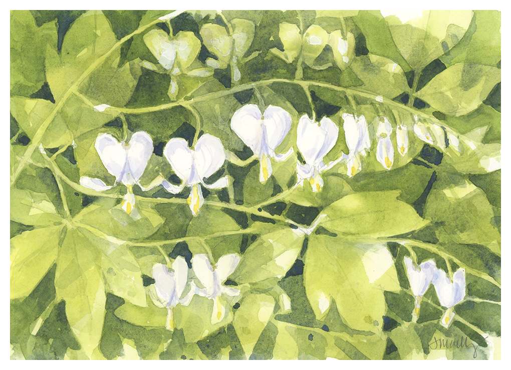 • Yes, these are white bleeding hearts, but they are different from Dutchman’s Britches (Dicentra cucullaria), which flower very early in spring. This is the common bleeding heart that you typically see in pink, only it’s a white variety (Dicentra spectabilis Alba). It’s quite lovely. I’m glad the reminder to enjoy the process and work at your own pace was useful. I can relate to spending hours on some mundane subject and wondering what’s the point. But it’s the process and the doing that sometimes count more than the finished page.