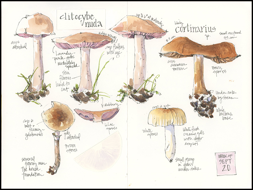 Tips and Techniques– Use your sketchbook to try a variety of artistic approaches. Part of what’s keeping me going on mushrooms week after week is not only the incredible variety, but also the challenge of finding new ways to paint them. The pale puffballs growing from leaf litter seemed perfectly suited to negative painting– a series of layers that move from loose to defined and light to dark. In contrast, the diagram on the right side of that page was simple and quick. The clitocybe and cortinarius page is my traditional pen and ink approach, which works well for fitting a lot of specimens on a page, noting key features, and trying to figure out what they are. I recently saw an artist who created a whole jumble of mushrooms on a page and I thought that would be fun…but maybe next year.