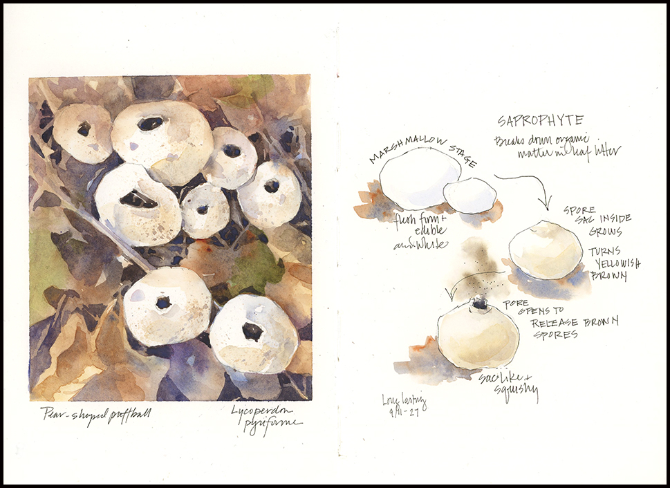 2. I love your posts and beautiful art work. Just a word of caution not to inhale the spores of the puffball when they “puff”, as it could be very poisonous to have the fungus in your system. I didn’t know that in the beginning when my kids and I used to make them “puff”. Evergreen Erb on a mountain in Vermont