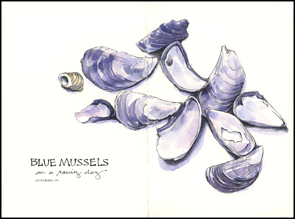 1. And a moody blue morning to you too, Jean. What a wonderful gift of mussels from Maine. Beautifully rendered. Your narratives, as are your paintings, always bring me instantly into your world. But your brief prose accompanying the painting is exceptionally descriptive …. I close my eyes and can smell the ocean, can hear the mournful cry of loons, and instantly recognize a kingfisher’s aerial rattle, all as the firey colors of maples and marsh warm me on a rainy, misty day. I was on that rocky beach and saw you in the distance examining the mussels ……. and I waved! Ha!