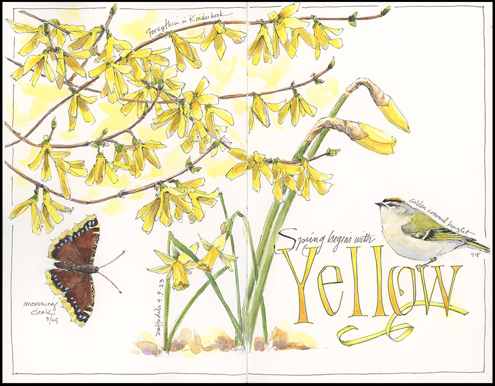 This piece began a few weeks ago when I spied a mourning cloak butterfly basking on the ground at the edge of the woods. The adults of this butterfly overwinter hidden in tree cavities or under bark. I painted it on this page not knowing what I might find next. Over the last few days, forsythia has begun to bloom and a flock of golden crowned kinglets visited our yard, signaling the coming of warmer days and more buds, blooms, and returning birds. Bright spots of yellow– such a welcome beginning to spring!