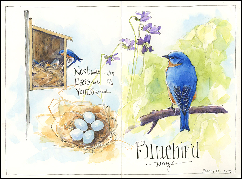 I’ve been teaching “Painting the Colors of Spring” for the last few months, which has made me even more aware of the subtleties of color at this time of year. We started with earth colors back in March, took a deep dive into yellows and greens in April, and ended this week with an in-depth look at blues and violets. Right on cue, the bluebirds in our yard finished laying five pale blue eggs, the lilacs and violets are in bloom, and the sky was clear and bright all week. I treasure these Bluebird Days and hope you have too.
