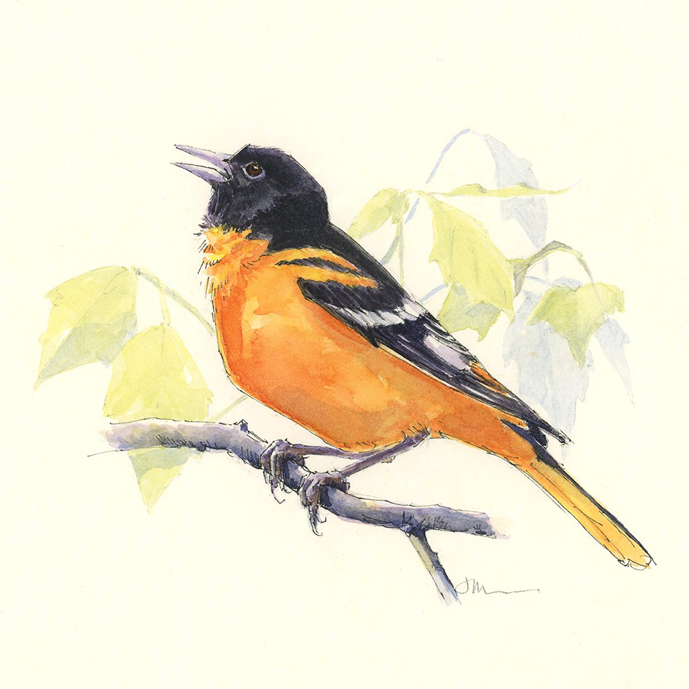 Tips and Techniques– Sometimes drawings come effortlessly. Many times they don’t. And sometimes it’s best to start over. Such was the case with this piece. I struggled for more than an hour to get the proportions and posture right on my first go at an oriole this week. I was in deep, but it just wasn’t working. Frustrated, I decided to walk away. The next evening, I started on a fresh drawing, and this time the bird took shape quickly. As hard as it is to abandon a drawing or painting, sometimes it’s the best thing you can do. If at first you don’t succeed….