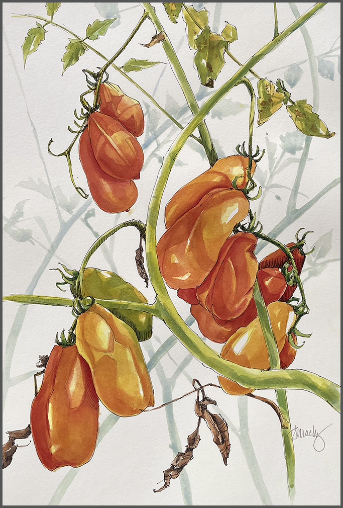 10. Those Tomatoes are lovely I think I should go to the greenhouse and draw before they are past their prime. I planted San Marzanos for the first time. I will try the pie sounds yummy! Thanks for the paintings of the tomatoes they are so bright and cheerful – another summer treat!
