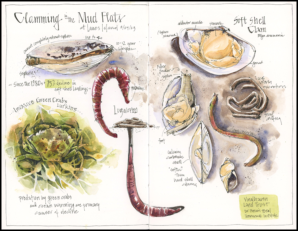 If you’ve ever enjoyed a clam roll or chowder or steamers, then you know the flavor of Mya arenaria, the soft shell clam. Before these mollusks reach your table, they eek out a life burrowed in soft mud or sand, filtering tiny plankton from sea water. Most clams today won’t reach their potential life span of 10-12 years, nor will they reach anyone’s plate, because they will be eaten first by highly invasive green crabs or other predators. Here’s a look at the ins and outs of clams and a few of the other creatures that share their watery home; sketched while sinking into the dark muck myself during a program on soft shell clams, hosted by the Vinalhaven Land Trust in Maine.