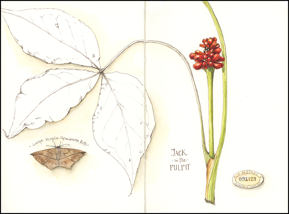 I found this Jack-in-the- Pulpit at the edge of our woods a week ago but it didn’t make last week’s Fall Collection. With its bright red berries and arcing leaf, it deserved its own page. Still, its three faded leaflets paled in comparison with the fruit, so I decided to let the berries get the attention. Finished? Unfinished? I think finished, especially after the moth showed up on our porch ceiling and made its way onto the page.