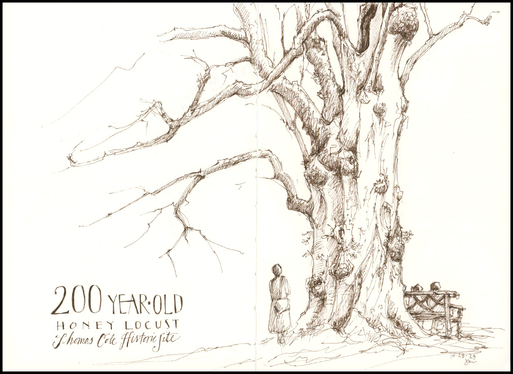 I could have used twice as long and four times the size of my sketchbook to really convey how gigantic this Honey Locust at Thomas Cole Historic Site in Catskill, New York is. Instead, my time for art has been very short this weekend, so I decided to stop here. I may add watercolor, but I’m not sure– I like it as an ink sketch, but I can envision some fall color on the page, too. Pausing seems like the best choice for the moment.