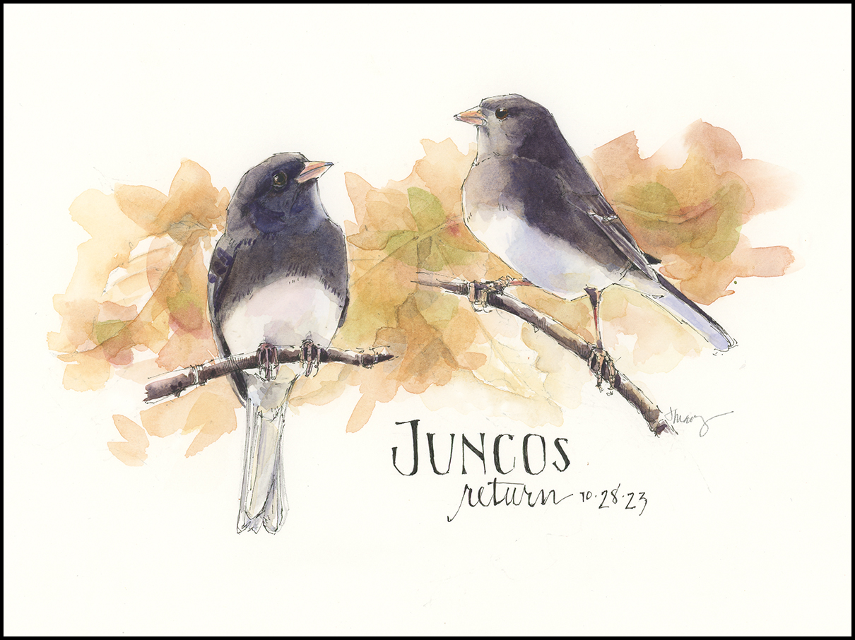 Tips and Techniques– I painted these juncos yesterday during my workshop “Knowing When to Stop” at Winslow Art Center’s free Autumn Art in Action Festival. At each stage of a painting, I evaluate color, values, details, shadows, and composition, slowing building up layers of paint until I’m satisfied with each of those things. These criteria help me make decisions about what to do next and can help prevent paintings that are under-or-overworked. If you struggle with knowing when to stop, try looking through that lens and see if it helps.