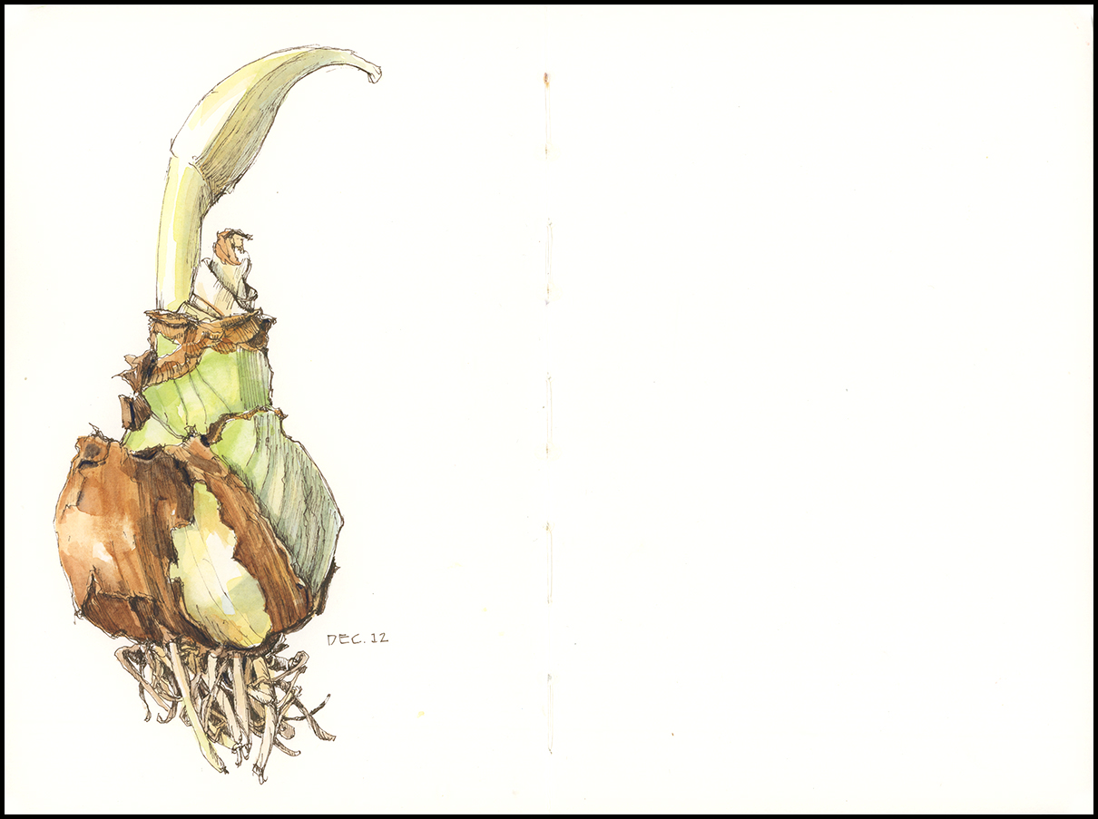 The great promise of the amaryllis begins as soon as you open the box and take out the naked bulb. The fact that this thing, this ball of a plant, will produce a huge red flower is remarkable. But it seems to me that it is also beautiful right now. Maybe it’s just that I like drawing tangled roots. Or perhaps it’s the papery peeling skin and ghostly stalk that intrigue me. Maybe it’s all that potential holed up inside such an unlikely package. In any case, it’s the beginning of something beautiful. I hope this page is the same as I add to it over the coming weeks.
