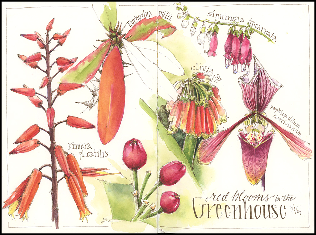 I met three artistic friends last weekend for a few hours of sketching and good cheer at the Lyman Conservatory at Smith College in Northampton, Massachusetts. It’s always a treat to be surrounded by greenery during the transition from winter to mud season. As it turned out, hundreds of other people felt the same way. The place was packed. I had to be careful in the cactus room not to back into spines when letting people pass me in the aisles. And when I thought I had found a good spot to tuck in amidst the tropical plants, an acapella group arrived to serenade visitors. The music was lovely, but crowds soon followed. I wouldn’t trade my visit, or the chance to enjoy red blooms in the greenhouse, but I’ll appreciate the solitude of painting along the roads and fields once again.