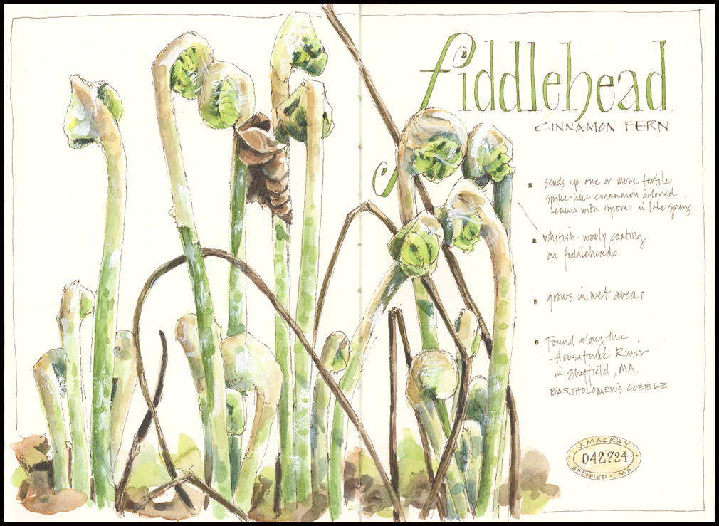 I spent the entire afternoon yesterday hiking and sketching ephemeral wildflowers and ferns at Bartholomew’s Cobble, a nature preserve in Sheffield, Mass. What a treat! Bloodroot sprang from rocky limestone ledges, and Dutchman’s breeches, hepatica, and red and white trillium carpeted parts of the forest floor. My wildflower sketches remain unfinished, so I have only these fiddleheads unfurling by the banks of the Housatonic River to share. How I wish you could go there in person to see them for yourself.