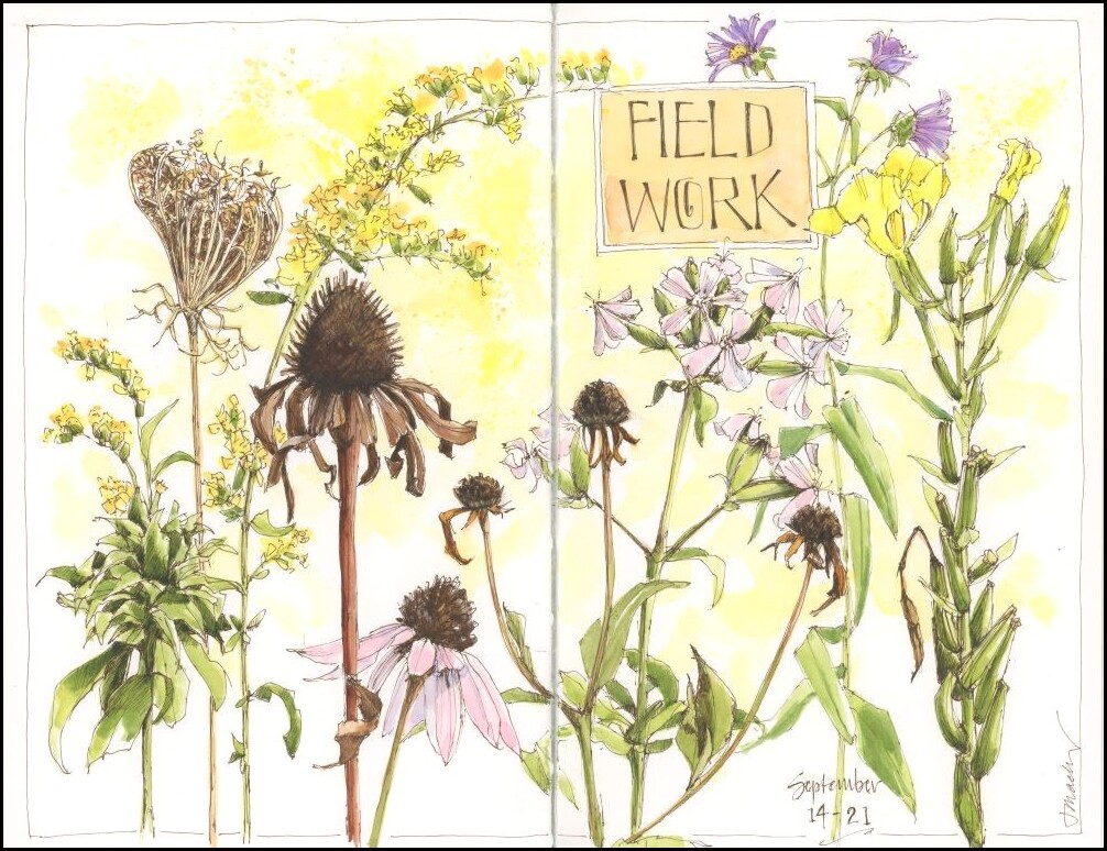Back in my own habitat this week, I enjoyed sitting and sketching in the field in the warmth of Indian summer sunshine. The goldenrod is in its glory, while other plants are fading. Still, I like showing flowers past peak and I find their curling petals and dried seedheads as worthy of sketching now as when they were in their prime.