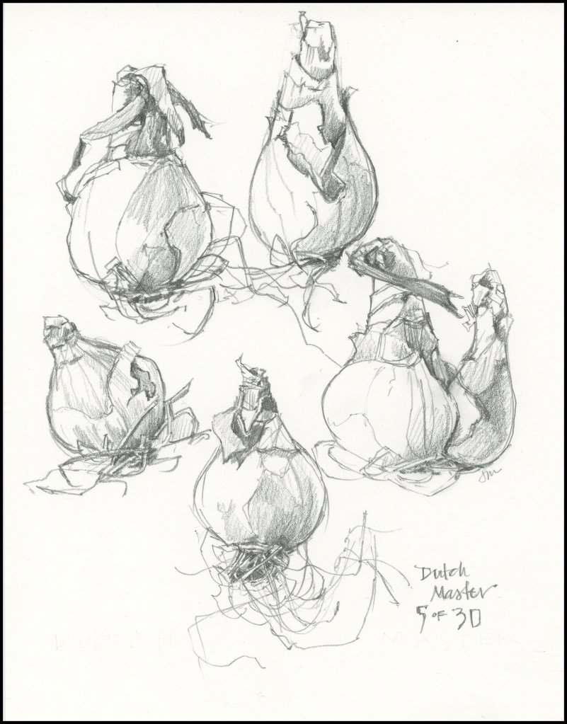 Funny you should say that. I wandered all over yesterday afternoon looking for something inspiring to draw– a big tree, a bird’s nest, a grand view– and came home empty handed. Then I looked down at the bag of bulbs on my back porch, pulled out my sketchbook, and spent a lovely half hour with pencil in hand.