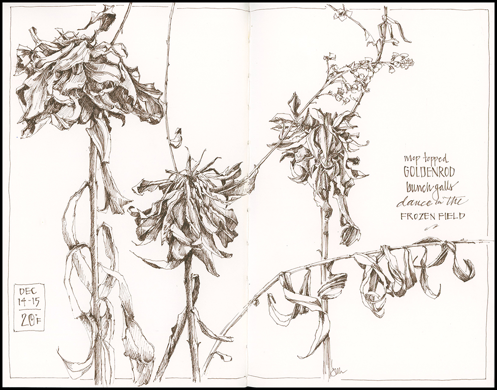 A wonderfully wintery holiday season, Jean! Your mop-topped goldenrod are certainly crispy frozen. From your description, it’s possible to hear the thin twisted leaves rattling in the breeze all the way to New Mexico! Love your sketch. The detail is quite amazing. Did you use ink? sepia? The shading is great too!