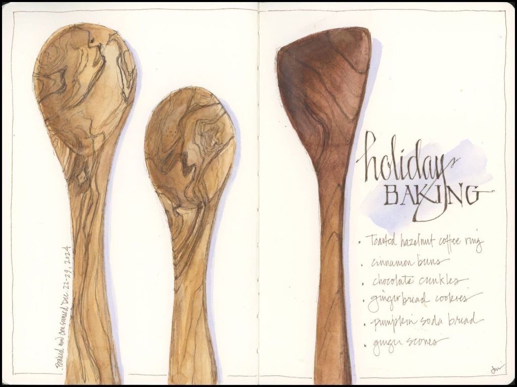Most of my creative time and energy during the holiday season goes into gift making, wrapping, and baking, and this year was no different. As a result, my sketchbook comes up short. So as the year closes out, I thought I’d devote a page to remembering the recipes I enjoyed making and consuming last week. I do wish I could share my sublime toasted hazelnut coffee cake with you as thanks for following my blog all year long. Alas, it is gone, so I send my favorite wooden spoons and a photo, along with my heartfelt thanks and best wishes for a Happy New Year.