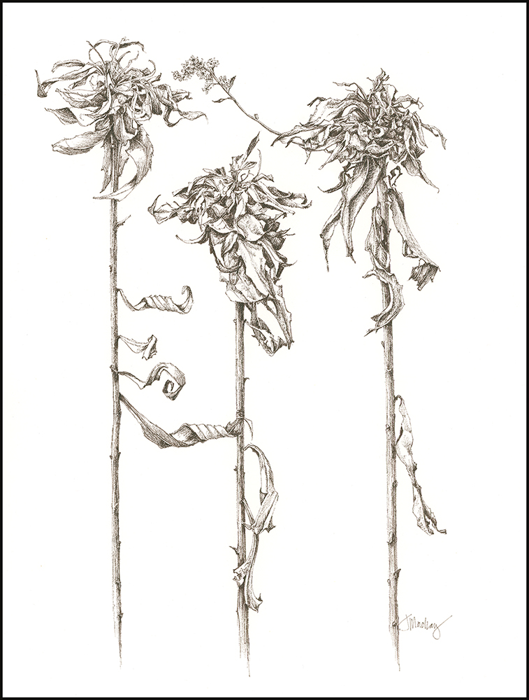 Tips & Techniques– Those of you who have followed me for a while know that goldenrod galls are a perennial subject. What made this different was the paper—it’s 140lb Fabriano soft press watercolor paper. Soft press is hard to find and only comes in sheets. It’s right in between hot and cold press paper, so it has just a bit of texture and behaves well when adding watercolor. The texture and absorbency of the paper doesn’t allow a Micron 005 pen to glide smoothly across it, but it makes the pen feel more like a pencil when shading and gives the drawing an Old-World feel. Always good to mix it up!