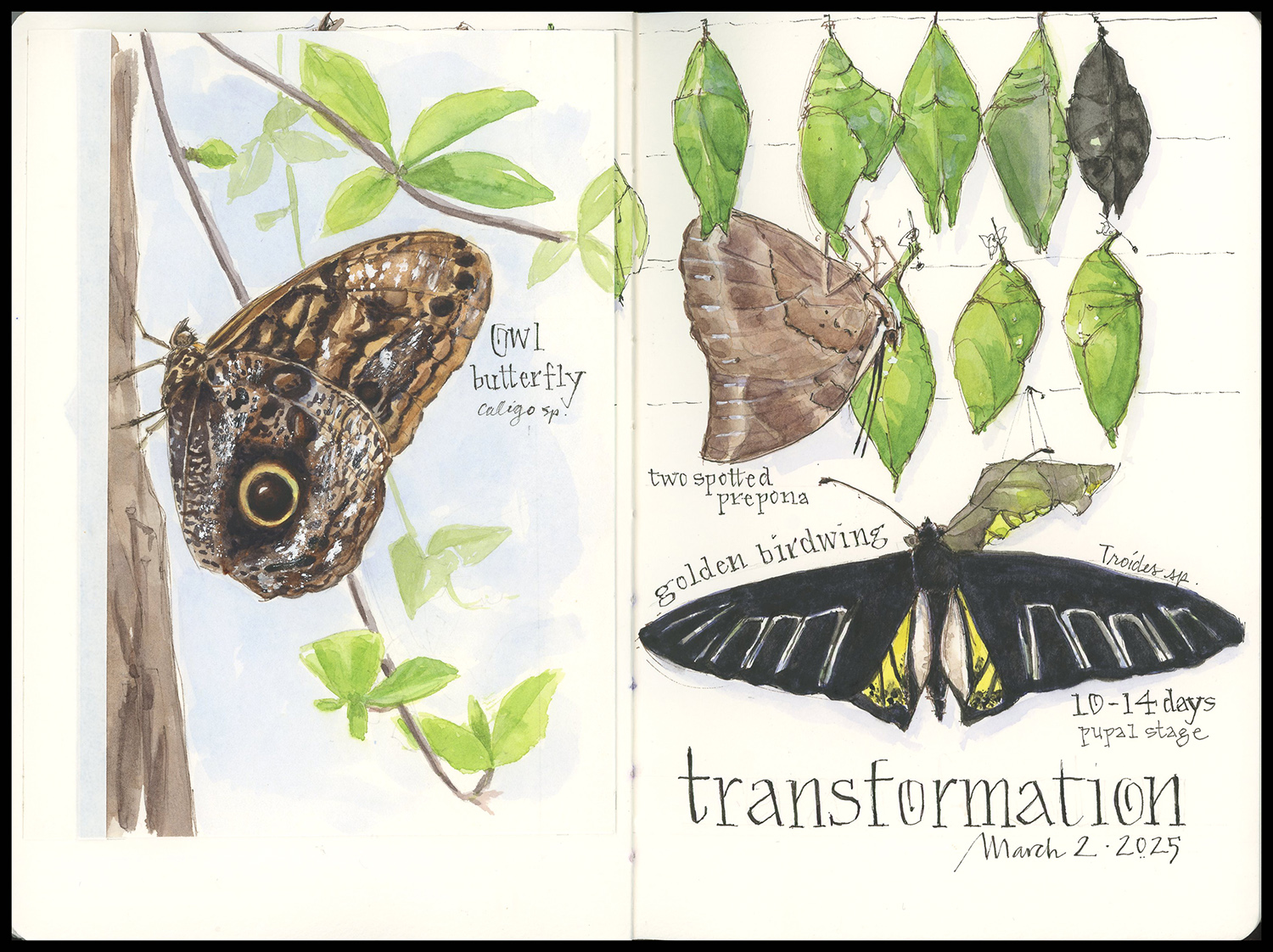 Tips & Techniques- This journal page takes advantage of an add on flap to extend the view. I was really intrigued with the large chrysalises on the left, but didn’t know what came out of them until it was nearly time to leave the conservatory. Because there wasn’t room on the page to add the owl butterfly, I decided to paint it on a separate sheet to add it as a flap that would reinforce the concept of transformation. At each stage of painting this piece, I doubted whether it would come together. I kept adding and adding– another pupa, more leaves, another layer of paint, more text– until finally I could see its own transformation and emergence.