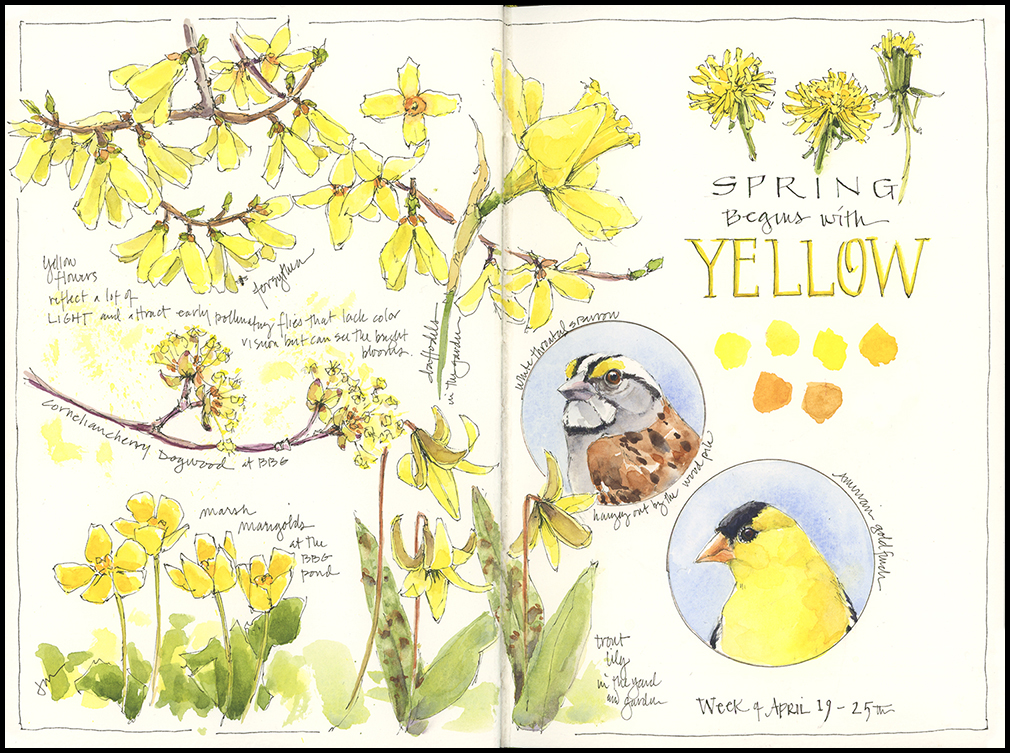 Bright pops of color against a landscape of brown, gray, and increasing green, who wouldn’t be happy about yellow flowers in early spring? Not only are we heartened by the blooms, so too are the flowers’ pollinators. Flies are among the first insects to awaken in spring. It turns out that they lack color vision, but they can perceive bright blooms against a darker background. And although they add moments of annoyance while sketching, I have to give them their due in service of spring.