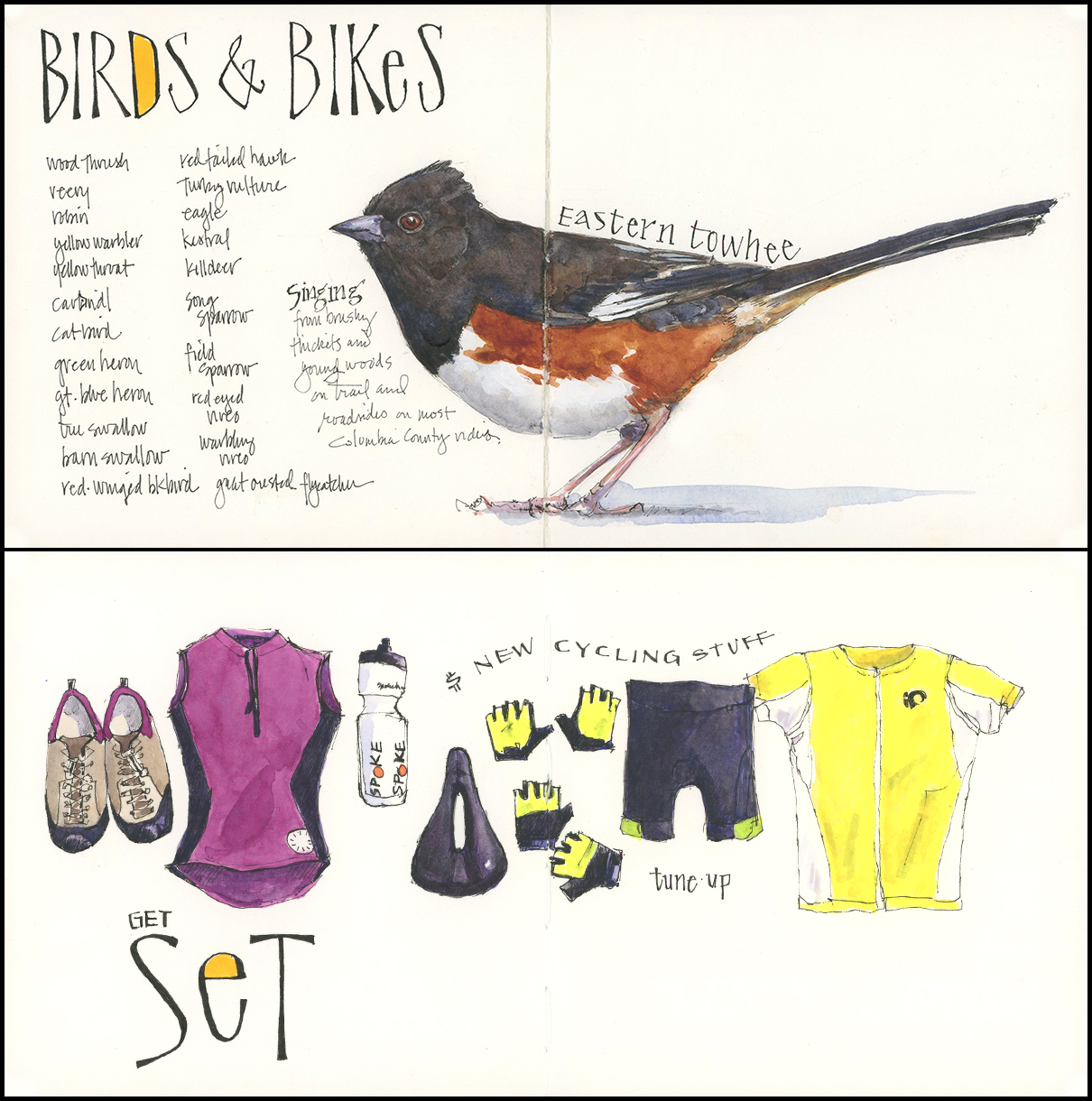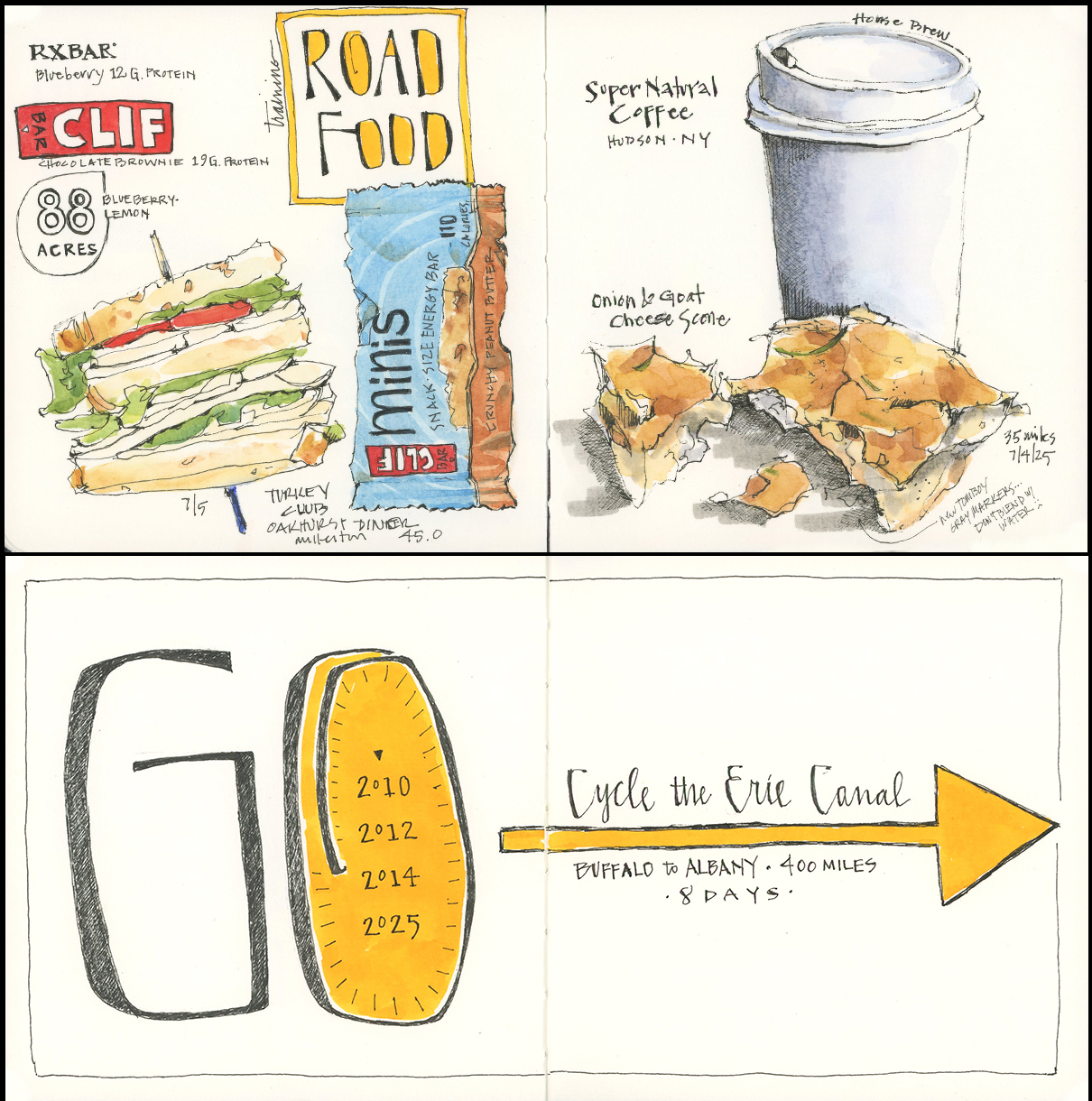 Tips and Techniques– When keeping a travel journal, I say: everything goes. Even though some of the things you record may seem mundane (like what you packed or ate or some stupid thing you encountered), those elements are often the most fun to look back on. I have kept a small journal on each of my cycling trips and they recall the triumphs and trials of each ride in ways that photos can’t. On this trip, I plan to focus on small details, quirky moments, a bit of humor, and food—which will be just what I need to make it to Albany. My other tip is to start a travel journal before you set off. It gives you a chance to test any new materials and decide on what is essential to bring. (Materials: Pentallic 5.5″ square watercolor sketchbook, Micron pen, watercolor, and Econoline deep yellow marker)
