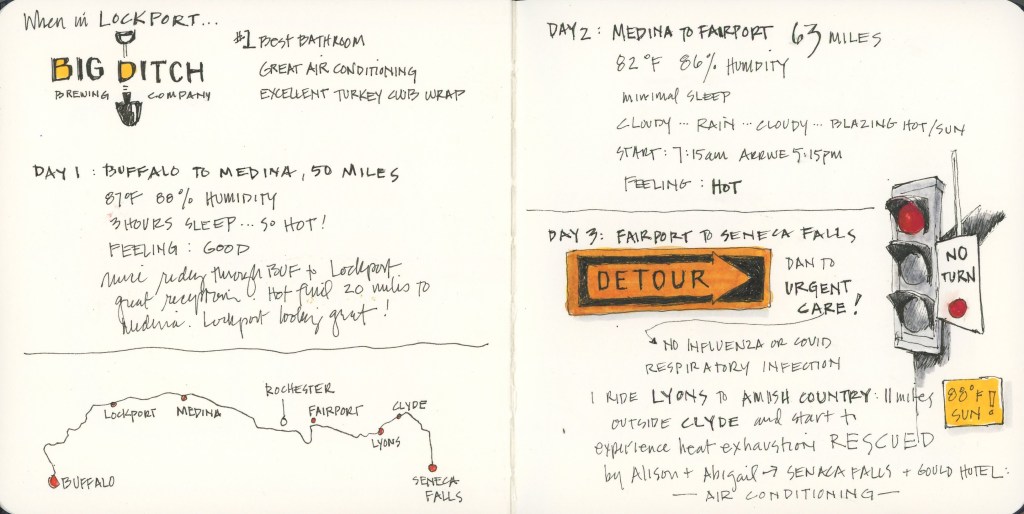 What a challenge you took on and then to have it all fall apart – sleepless nights, heat, illness -Yikes – so much to deal with. Glad to hear you are both home and I expect well now. I am also amazed that you were able to record any of the journey. I struggle to keep my drawing going when on the road in the best of times. I can write but drawing is harder for me. Maybe with time I will find my way as you have to be able to share images along the road as well. Glad you are all safe, well and home!