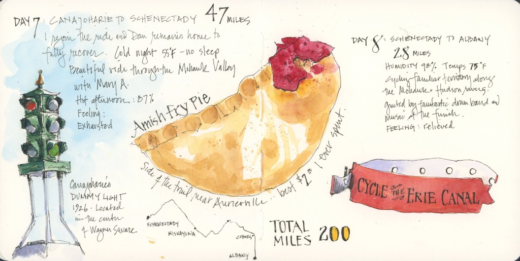 Well, I can now say with confidence, never again. Our planned 400-mile cycling tour (see previous post) was a combination of great cycling, good people, sleepless nights, extremely hot temperatures, and unexpected detours when my husband got sick. These pages aren’t beautiful, but they are an honest snapshot. I found it nearly impossible to record much along the way, but I thought I’d share this anyway to give you an idea of the trip and what a simple travel journal can look like. As always, thanks for following along!