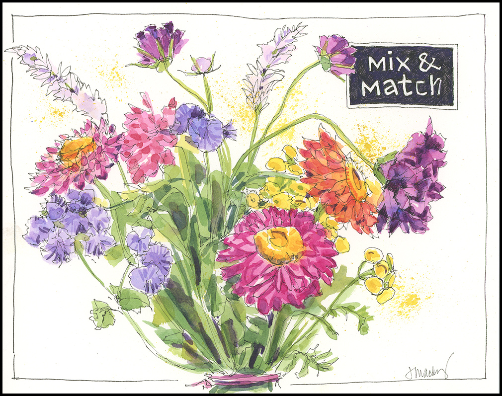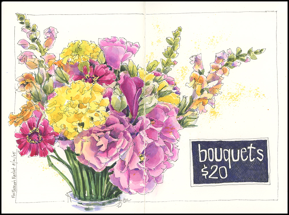 A few weeks ago, I wrote about my Farmers Market quest, and these two bouquets are some of my more recent discoveries. I used them as subjects for the final session of my Fun Farmers Market class, which wrapped up last week. There are many ways to paint a bouquet, but because I wanted to convey a bit of fun, we worked loosely for the ink sketch and then tried to keep the watercolor flowing, especially in the early stages of painting. The white on black label added a casual farmers market element to finish the piece.