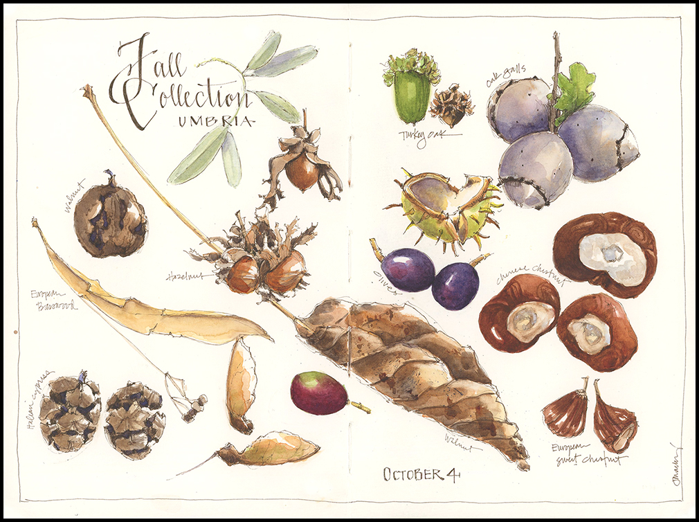 Mesmerized, enthralled, amazed! Seeing your exquisitely delicious collection of Umbria nature all in one place was overwhelming. It would be easy to become absorbed for hours in each page, asking so many questions, wondering more. The collection is a beautiful display of your style illustrating your subtle adjustments in approach based on subject. The collection is truly a collection, cleverly connected by color and tone, text and composition. Loving the fall seeds (and the oak galls are fascinating), the landscapes, birds, fungi, landmark trees, hints of historic living in the castle and culture (beautiful pottery), and an invitation to breakfast (here’s where drooling was embarrassing!). Your beautiful maps brought everything together perfectly.