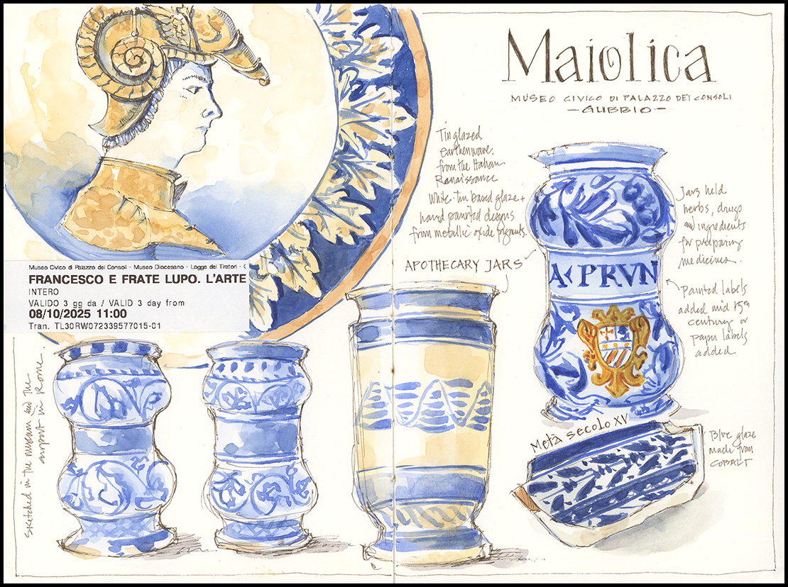 I had an exceptional week teaching in the Italian countryside in Umbria with Winslow Art Center, and I couldn’t have asked for a more enthusiastic group of participants. There is a quote that I shared with them from Italian painter Cennino Cennini (c.1360 to 1427), “Now then, you of noble mind, who love this profession, come at once to art and accept these precepts: enthusiasm, reverence, obedience, and perseverance.” Obedience aside, it exemplified the way in which they approached the lessons and techniques I shared throughout the week. As you can see, we tackled a number of subjects and came away with sketchbooks filled with an extraordinary experience.