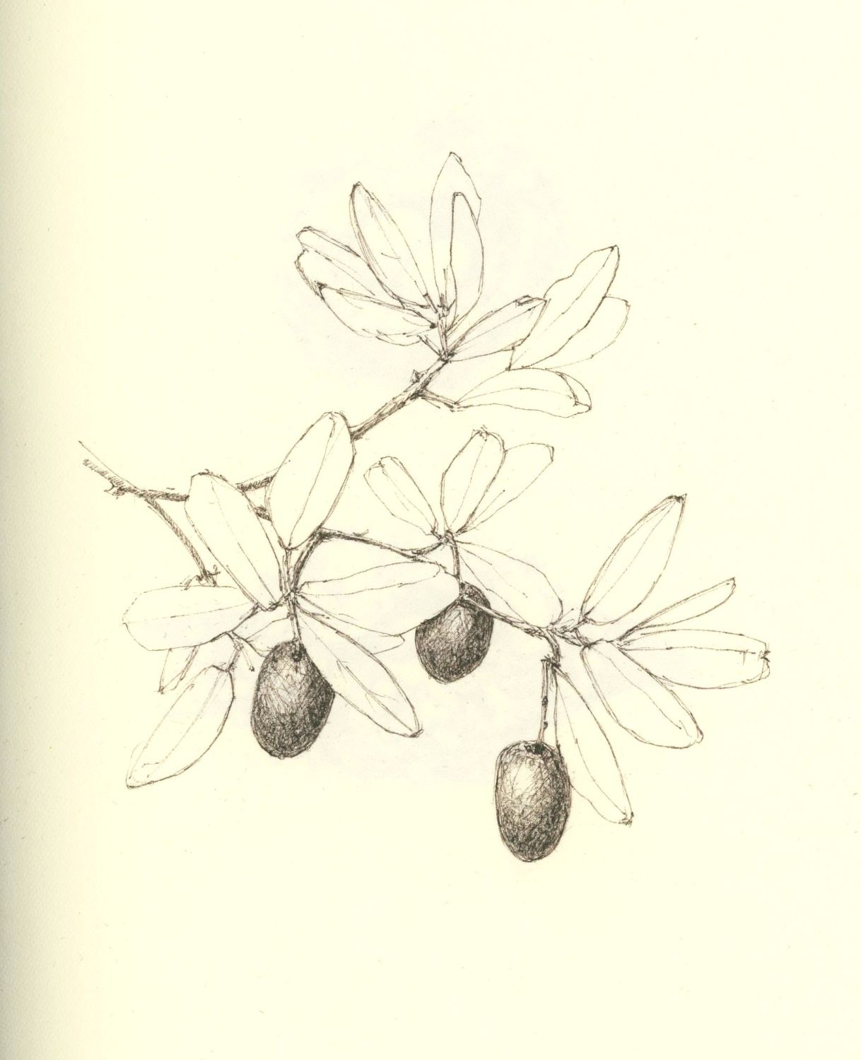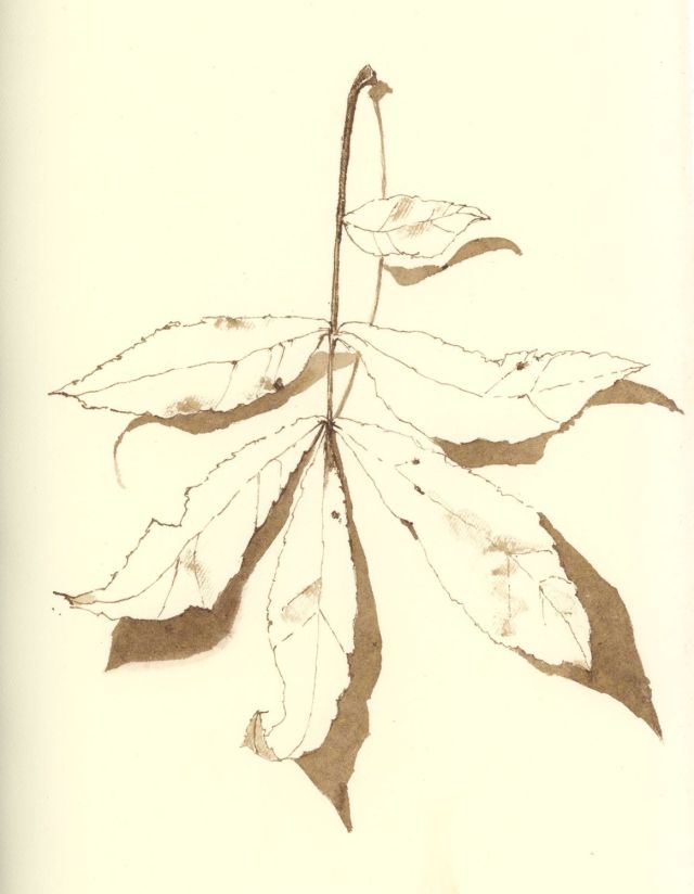 I sketched the bitternut leaves and hummingbird nests with a dip pen and Winsor & Newton drawing ink and did the olive leaves with a Micron 005 sepia pen. As you can see, I’ve also tested the ink using a brush and was pleased that the paper didn’t buckle at all. I’m eager to keep going and try some lighter washes and more complex subjects.
