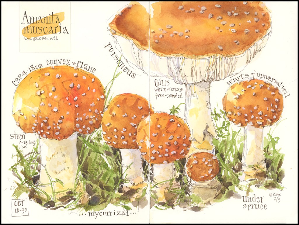 Tips and Techniques– I like to sketch mushrooms from life and right where they are when possible. It’s the best way to really observe all the things that will go into identifying them. It also helps you convey your sense of discovery and lots of subtle details. Take photos for reference or color notes if you’re painting inside later. (Materials: Micron 005 sepia pen, watercolor, 5.5×8.25 Handbook Journal Co 140lb watercolor sketchbook)