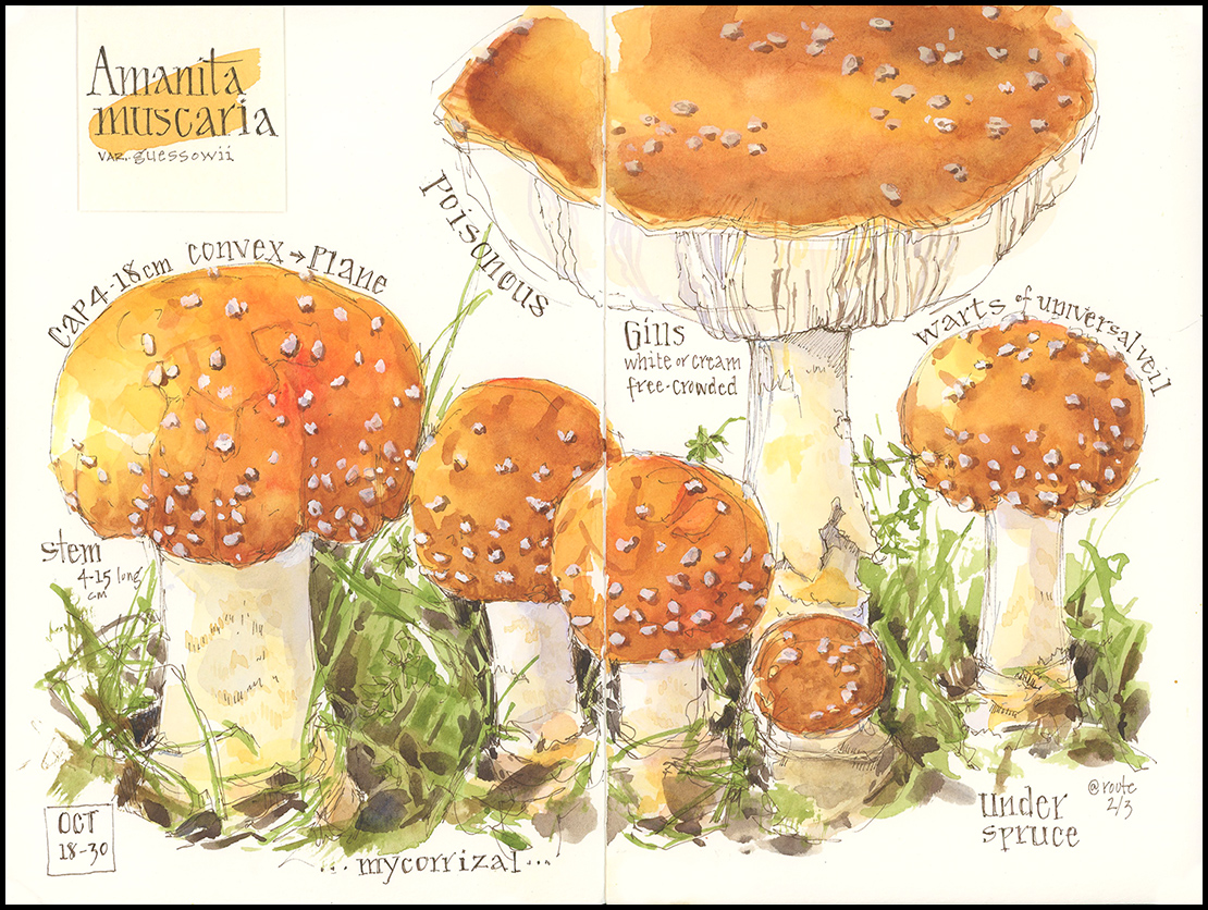 After a season marked by a dearth of mushrooms I found a mother lode of amanita growing under a large spruce tree just down the road last week. They were so colorful and numerous I could hardly wait to go back home and retrieve my sketchbook. When I nestled under the branches later in the day to sketch, I was surprised by the driver of a passing car who rolled down his window and called out—“Amazing mushrooms!” This was a first. I’ve had people slow down to see what I’m doing, and once had someone come by to see why I was parked on the road by his property. But never has someone joined in my enthusiasm. How wonderful!