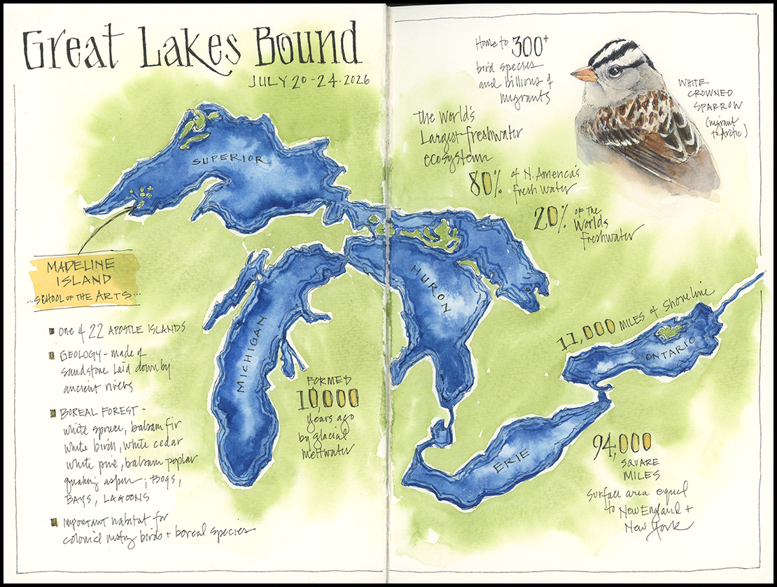 The “research phase” has officially begun for my summer workshop, Drawn to Nature, at Madeline Island School of the Arts on Lake Superior, June 20–24, 2026. I’m starting with the wide view—looking at the Great Lakes as a whole—before narrowing in on Lake Superior and the many things that make Madeline Island so special.