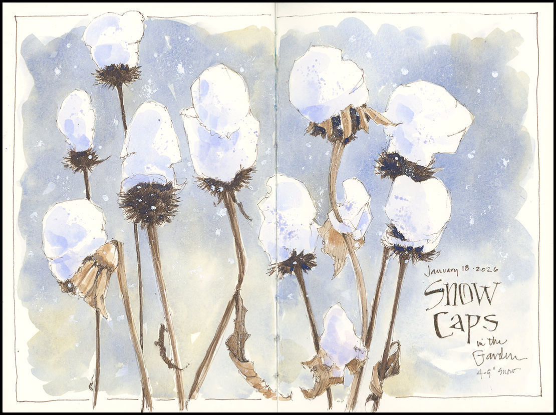 It felt so great to get outside to sketch yesterday afternoon, even in snow. I’ve painted these flowers in summer, fall, and now winter. They look rather handsome in their snow caps, don’t you agree?