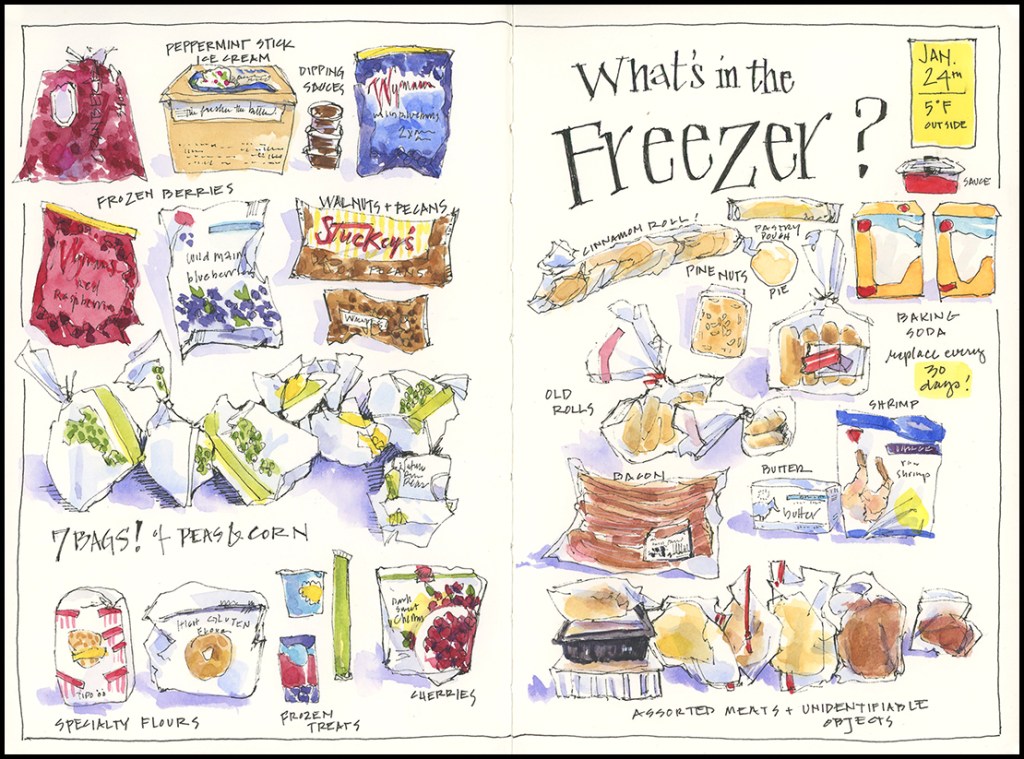 With much of the U.S. locked in single‑digit temperatures and snowstorms, it felt like the perfect moment to embrace the cold and venture into the depths of our freezer— which had evolved into a gigantic, cluttered heap of unidentifiable objects. I decided to make the most of this otherwise uninspiring chore by sketching my findings, partly for posterity and partly to prove I survived the expedition. When I unearthed seven bags of peas and corn, I knew I’d made the right call. And so, at the risk of oversharing, here’s the inventory. Not bad for a frigid afternoon’s work.