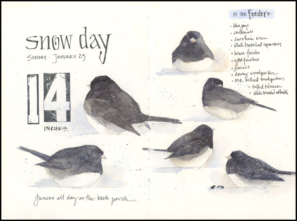 The silver lining of the past week’s snow and cold is the flock of juncos that are hanging out on our back porch every day. We put up an extra bird feeder there to help them through the freezing weather and heavy snow. Unfortunately, my perch for sketching by our back porch door has proven rather drafty— the birds are surviving the chill far better than I am.