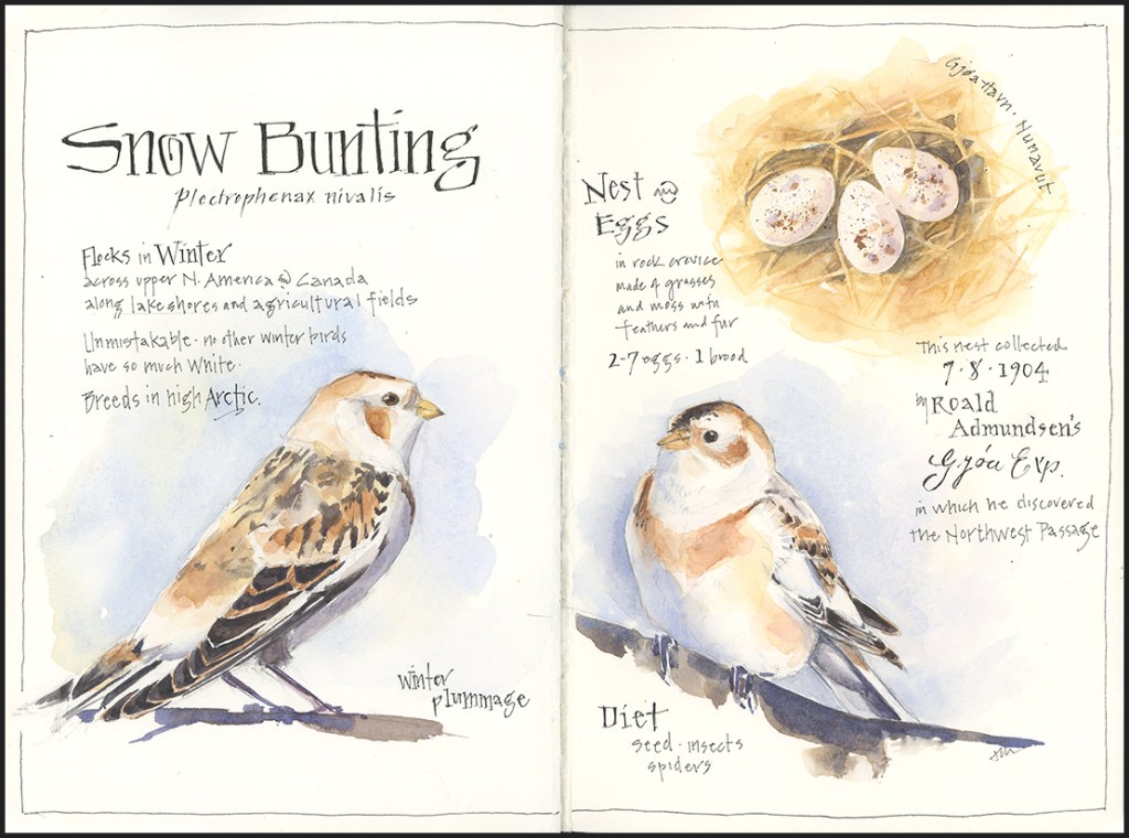 So here’s to snow buntings, a 122-year old nest (and the birds it was taken from), a crew of intrepid explorers—and the unexpected discovery that connected me to them through my sketchbook.