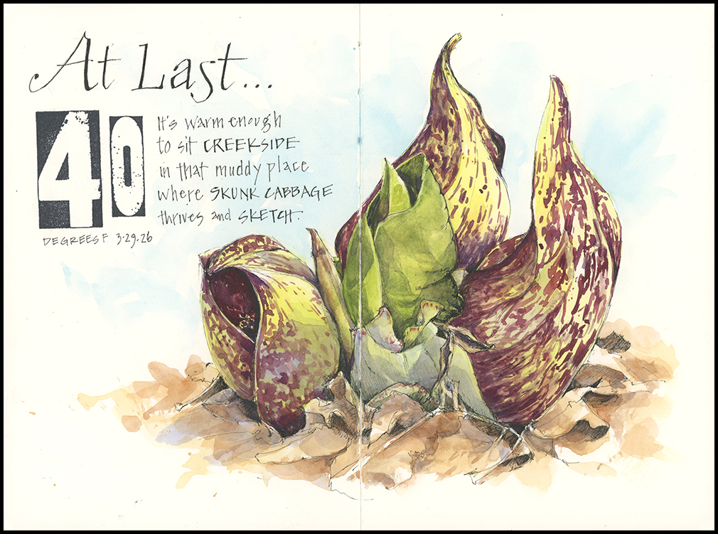 Finally, it’s warm enough for me to make my way through the woods to the muddy edge of a creek where the skunk cabbage thrives and sketch. For weeks, I’ve gone out scouting good locations, watching the maroon spears push up through frozen earth, watching the ground give up its ice as the spathes open. I’ve been waiting for a day when work, wind or fading daylight wouldn’t keep me indoors with an empty sketchbook…and here it is.