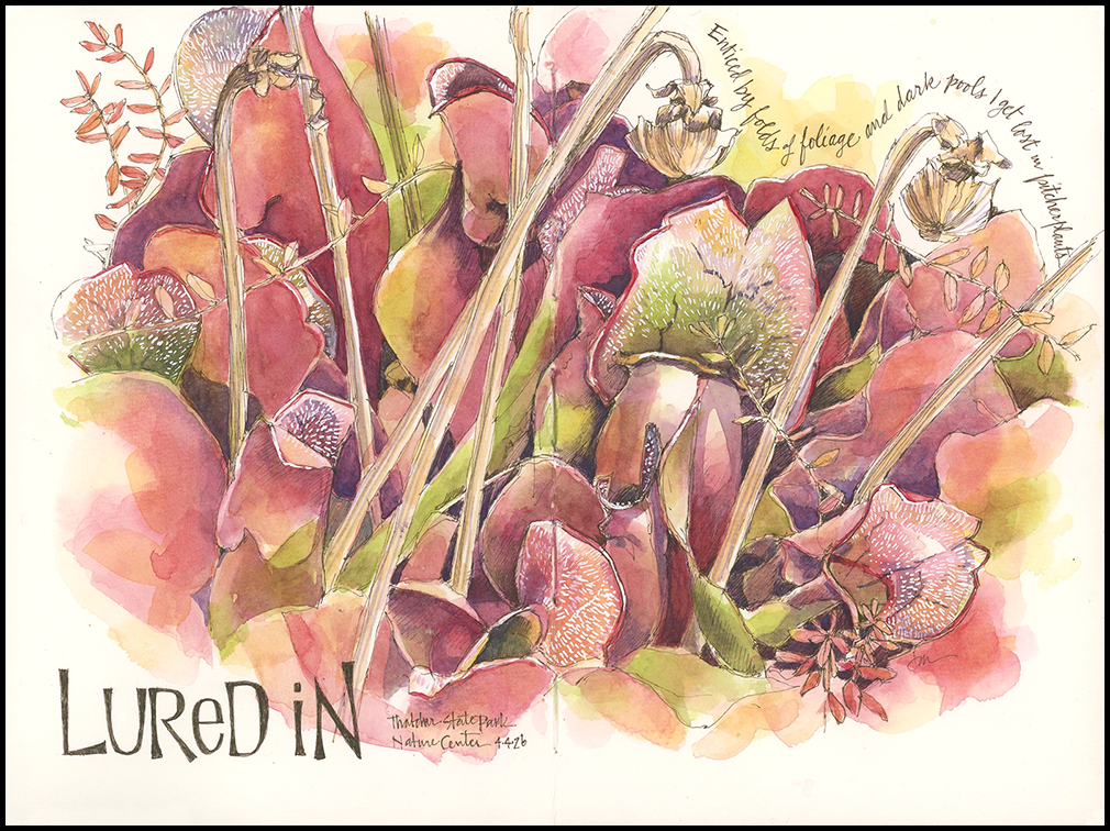 Enticed by folds of foliage and dark pools, I get lost in painting pitcher plants. All those reds blending into greens and purples. Tiny hairs leading downward into open mouths. It’s not hard to see how these plants work their magic. Once lured in, leaving is difficult—and for some, impossible.