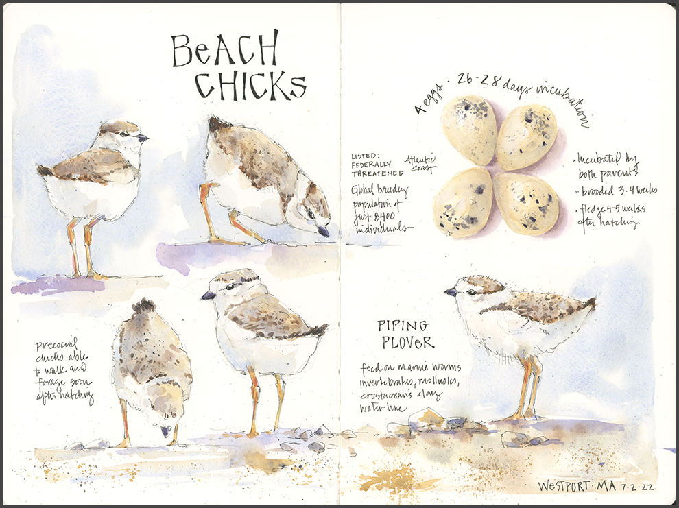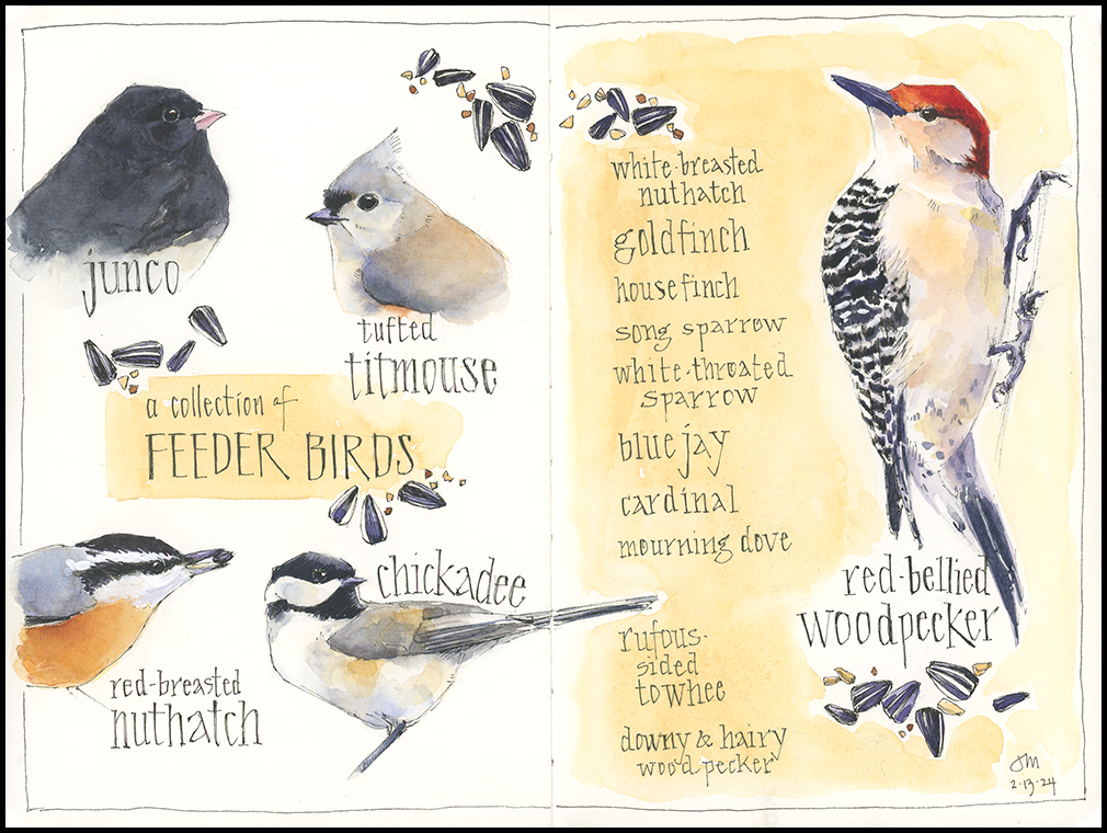 14. I bought your book, and enjoyed your presentation at last year’s Wild Wonder Conference, and am looking forward to this year’s. I have been nature journaling for just over a year, and it has become a huge part of my life (in-person club, online conference, trip to Ecuador with Marley Peifer). But while I’m happy with my images, I always feel like my text ruins the page. I love the way your deceptively simple text looks — it seems to compliment your drawings, rather than detracting from them. Any pointers? Do you have an alphabet you use or are you just lucky enough to have artistic printing?