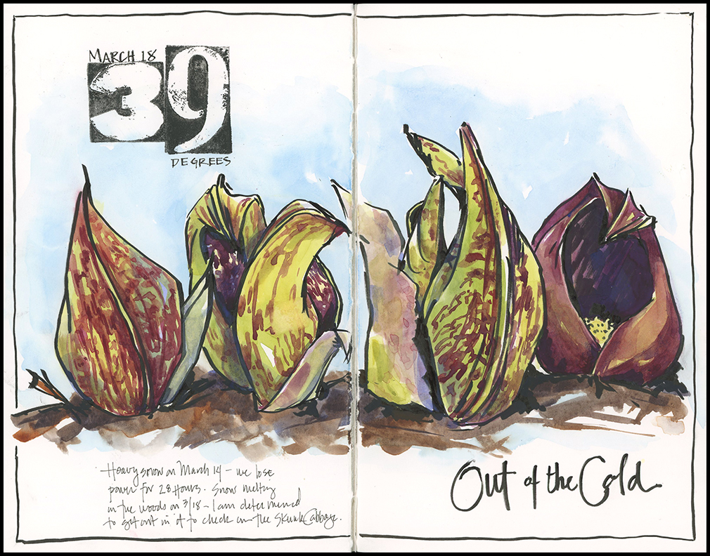 Out of the snow and the mud and still-frozen ground, the skunk cabbage emerges each year. I go in search of its hooded flowers in bottomland woods, where it pushes up from the margins of vernal pools and muddy streamside banks. Sketching it each March is almost like a rite of passage, marking the transition from winter to spring. Despite the snow and cold, the great thaw has begun. We have turned a corner.