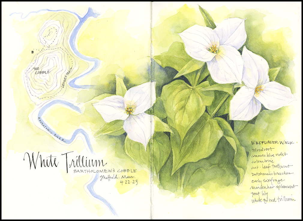 Tips and Techniques– Because many spring ephemerals are white – including bloodroot, Dutchman’s breeches, trillium, cut-leaf toothwort, and mayapples – you’ll need to decide how to highlight them on white paper. A simple shaded drawing may be sufficient. But you could also consider using white gouache on toned paper or painting greenery behind the white flowers. I wanted to take my time with the white trillium, so I sketched the flowers in pencil in the field and then painted them at home using negative painting techniques to build up the layers of leaves surrounding the flowers. It takes time for the each layer of paint to dry, so this is not a good technique to do in the field.