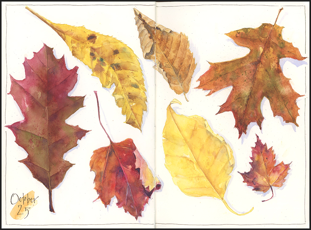 Tips and Techniques– I always think that painting leaves will be easier than it is. There must be a way to simply splash bold colors on the page, but I haven’t figured it out. Instead, I take the slow road: a pencil sketch, followed several layers of watercolor. I like starting with a wet-in-wet wash to let colors merge on the paper. Then I deepen the color and add details and shadows last. If you have not painted leaves before, you might start with just one or two. This will build your skill and confidence before tackling more.