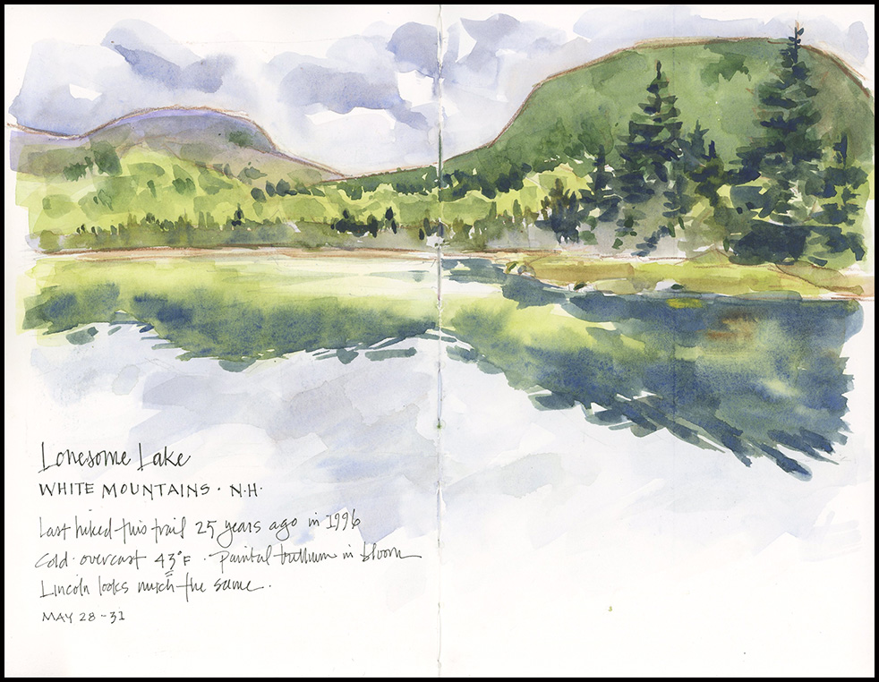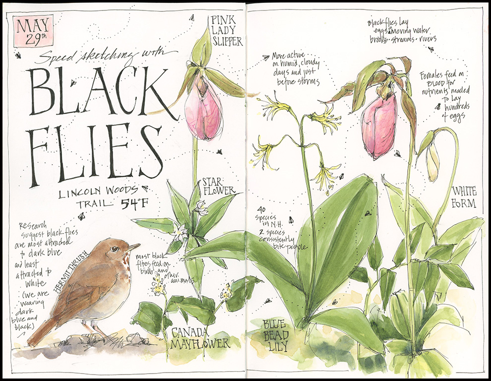 Tips and Techniques– Go with what you’ve got. I was eager to sketch the many beautiful wildflowers in bloom during our hikes. But it was so cold that I couldn’t do so comfortably until the temperatures warmed into the 50sF. By then, black flies emerged and mercilessly attacked. I tried to “embrace the place,” but after speed sketching orchids, I decided to skip the trillium. Ultimately, what was the sketch about? The damn black flies.