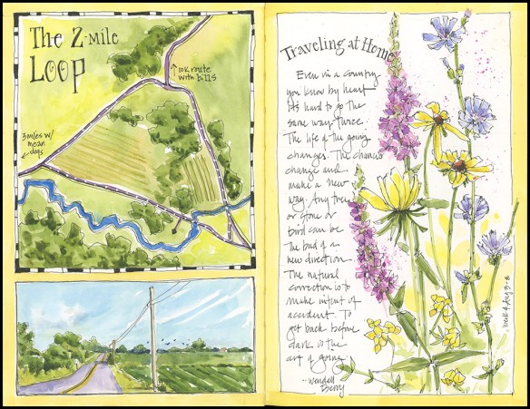 While we are at home day in and day out, I travel the same roads over and over. I add variations now and then, but mostly it’s the same loop past fields of soybeans and corn, past woodlots and overgrown meadows, past neatly trimmed front yards.