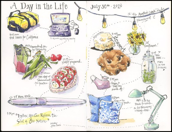 The Day in the Life page is a specific assignment I do about once a year. The idea is to do a sketch every hour of the day, but no sketch should take more than five minutes. Not only is this good practice for working quickly but it is also a nice way to record the ordinary things and moments that fill your days.