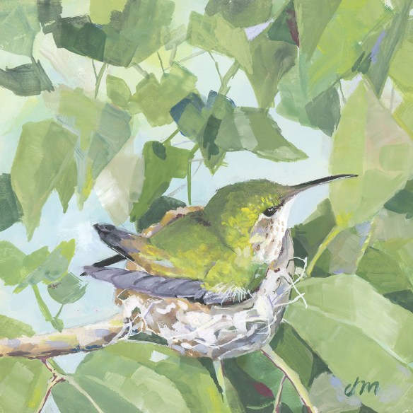 Tips and Techniques– I wanted to try gouache without a big investment, so I bought Windsor & Newton’s Primary Color Set (primary red, yellow, and blue, black, and white). This meant lots of color mixing, which was good. I don’t have much experience with gouache, so it took a lot of trial and error to figure out how to get the right consistency, as well as how to use white and black (something I never do with transparent watercolor). Although the new medium tested me, it also stretched my thinking. I’ve started a second hummingbird nest painting and I’m eager to keep learning.