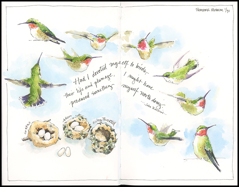 Tips and Techniques– Try sketching while standing up. I drew this nest in pen while standing in the field and painted it later at home. Standing encourages the use of your entire arm, rather than just the hand and wrist, which helps to keep your sketches loose. Sketching in the cold also encourages you to work quickly and not fuss too much.